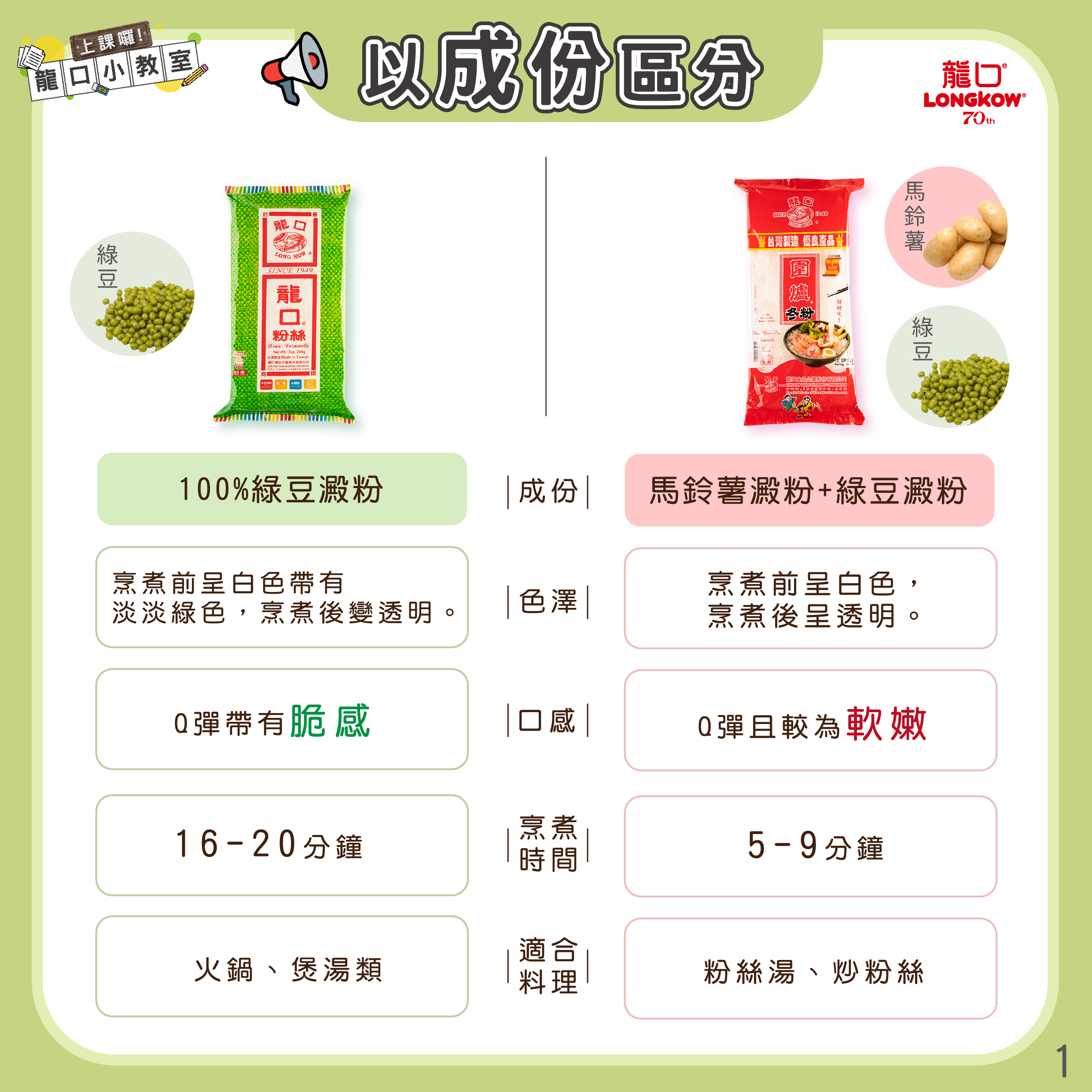 小編報你知:大部分市售龍口的粉絲,已經可以從包裝袋顏色來做區分囉!「綠色包裝」代表耐煮的純綠豆粉絲,「有機」「紅色包裝」則是馬鈴薯澱粉+綠豆澱粉的快煮粉絲唷!但購買前還是建議先看清楚產品背後列出的成分表唷!