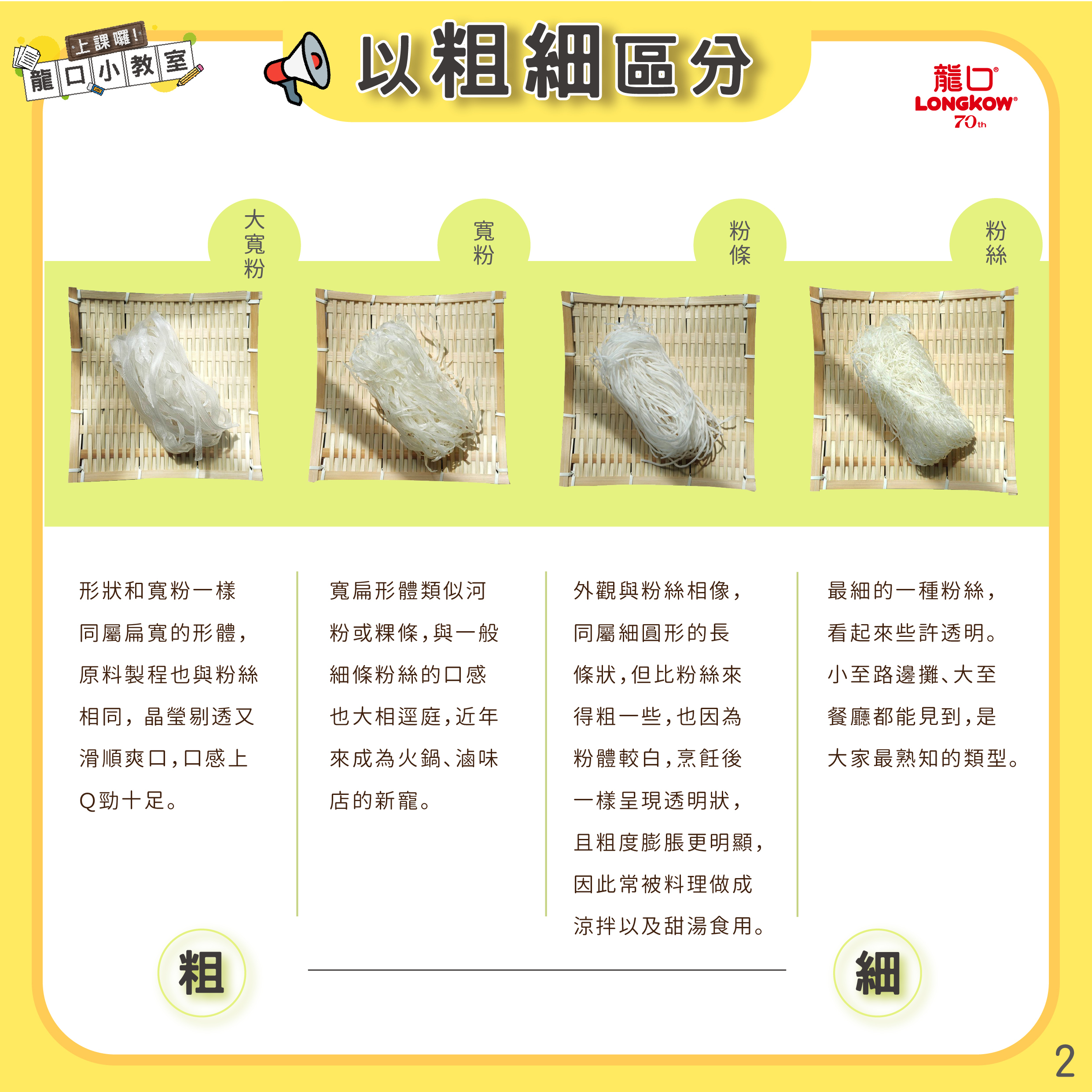 回到「龍口粉絲」的正題,在購買粉絲時,琳琅滿目的包裝是否也曾讓您面臨選擇障礙,最終只好憑著記憶,或是挑個看得順眼的就去結帳?但是若您仔細去看,會發現龍口的粉絲原來不只有一種!今天小編就要來教大家辨別粉絲的小撇步,以及該如何挑選專屬自己最對「胃」的粉絲。