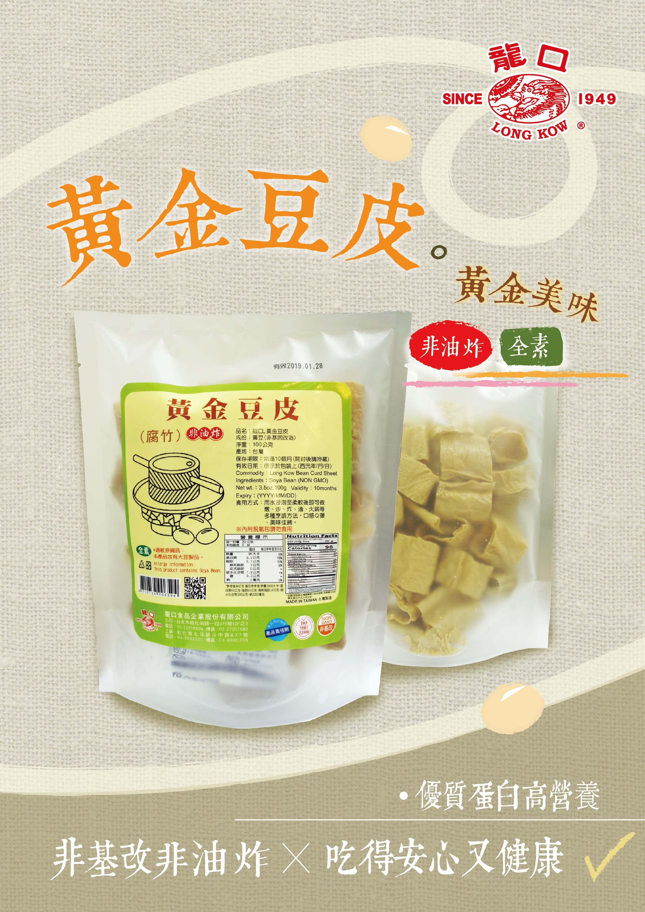 龍口的黃金豆皮(腐竹)嚴選非基改黃豆製成,傳統製程無油炸,吃起來清爽不油膩,對身體也比較不會造成負擔喔 !