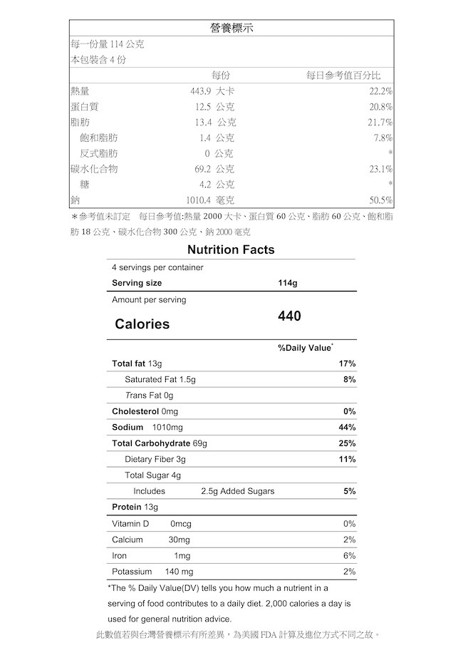 過敏原資訊:本產品含有大豆、含麩質穀物及其製品,不適合對其過敏體質者食用。生產製程廠房,其設備及其生產管線有處理甲殼類、芒果、花生、奶類、蛋、芝麻、堅果、含麩質穀物、大豆、魚類、亞硫酸鹽類等及其製品。